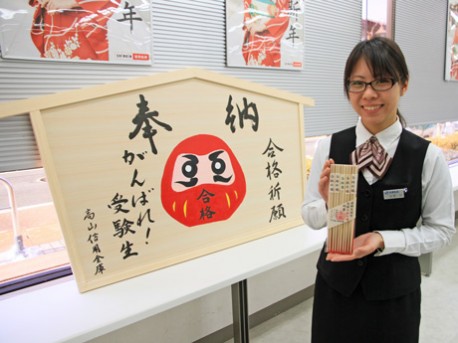 2月14日に奉納予定の絵馬図柄は七転び八起きの「合格だるま」。申し込み者先着300人には飛騨のスギ間伐材で作った「すべらない五角(合格)箸」を進呈する
