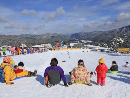 大勢の家族連れで賑わったキッズゲレンデのソリコース。