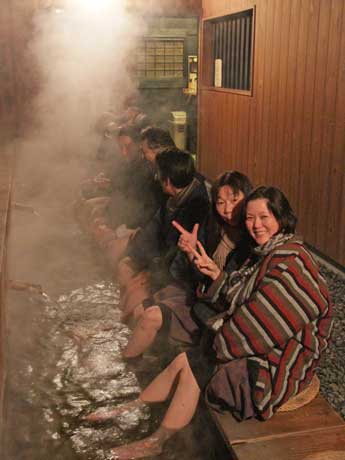 「舎湯(やどりゆ)」内に併設する足湯を楽しむ宿泊客ら