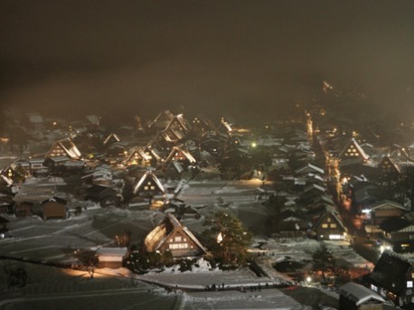 計117個のライトが国指定重要文化財の和田家など合掌造り家屋36棟を幻想的に照らし出す