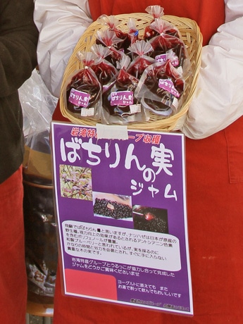 同日販売されたもう一つの新開発商品。「ばちりん」とは「ナツハゼ」の事で、高山市岩滝地区との連携商品。地元の山で採れたものだけを使用。ブルーベリーに似た風味が特徴でこちらも貴重品。1袋100グラム入り=500円。