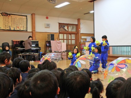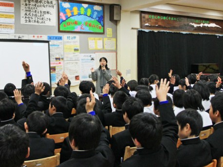 新しい金山小の校章と校歌を掲げる松山正人校長