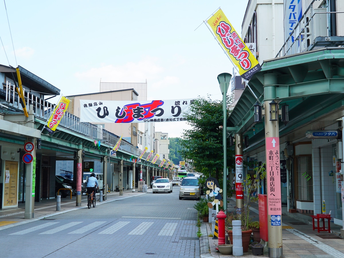 <h2>のぼりや横断幕を掲げ、後は来場者を待つばかりとなった高山本町三丁目商店街</h2>